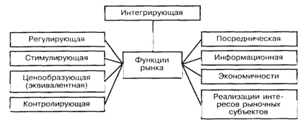 Интегрирующая функция состоит в соединении сферы производства (производителей), сферы потребления (потребителей), а также торговцев-посредников, во включении их в общий процесс активного обмена продуктами труда и услугами. Без рынка производство не может служить потреблению, а потребитель не сможет удовлетворить свои потребности.