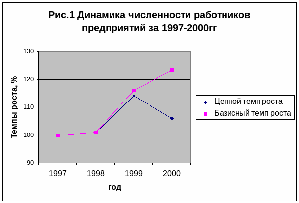 Цепные показатели указывают на рост или снижение значения по сравнению с предшествующим годом. Так, в 1996г по сравнению с базисным возрасла на 104%. 1997 и 1998гг – тенденция к уменьшению численности. В 1999 г. по сравнению с 1998 резко подскачила численность (114%), а в 2000г. опять упал до 106%.