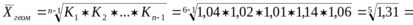 Среднегодовой темп роста исчислили по формуле через значения уровней ряда. Но для расчета этого показателя может применяться и другая формула - средняя геометрическая. Она основана на перемножении цепных темпов роста (так как проценты и коэффициенты никогда не суммируются, что является грубой ошибкой, их можно только перемножать):