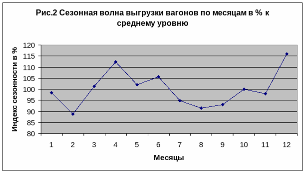 Прогноз объемов выгрузки вагонов на каждый месяц требует полученную сумму 41,67 умножить на значения соответствующих индексов сезонности для каждого месяца.