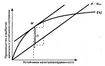 Уровень капиталовооруженности, соответствующий значению Кm, называется устойчивым и соответствует равновесию экономики в долгосрочном периоде. При значении капиталовооруженности меньшие КM,(например, КN) инвестиции превышают выбытие, и запасы капитала увеличиваются. И наоборот, при значениях капиталовооруженности больше уровня КM(в частности, КP), выбытие превышает инвестиции, и запасы капитала уменьшаются. Независимо от первоначальной величины функционирующего капитала, при которой начинает развиваться экономика, последняя затем достигает устойчивого состояния.