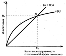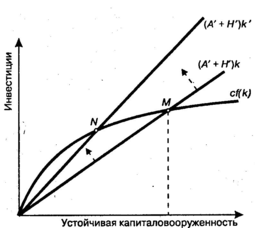Увеличение разности нормы выбытия капитала и прироста населения указывает на ускоренное сокращение капиталовооруженности труда, так как капитал распределяется на большее число занятых. Экономика находится в устойчивом положении, если капиталовооруженность остается неизменной, следовательно, дополнительные инвестиции должны поддерживать на установившемся уровне фондовооруженность вновь вовлеченных в производство работников и компенсировать выбытие капитала. Для того, чтобы экономика находилась в устойчивом положении, инвестиции должны компенсировать выбытие капитала и рост населения. На рис. 5 этому условно соответствует точка М пересечения кривой инвестиций cf (k) и линии выбытия капитала и роста населения (А '+ H') k.