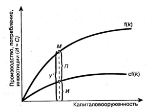 Для выяснения наибольшего потребления обратимся к известному нам уравнению у = п + и, откуда п = п — и, что определяет потребление как разность между производством и инвестициями. С целью определения устойчивого потребления подставим в последнее уравнение значения у и и, соответствующие условиям устойчивого уровня капиталовооруженности f(k) и А'. Kосн. Учитывая, что при устойчивом положении инвестиции равны выбытию капитала (и = А' Kосн), получим