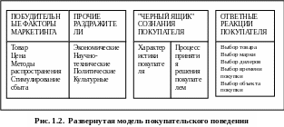 На рис. 1.2 эта же модель представлена в более развернутом виде. В левом прямоугольнике - побудительные факторы двух типов. Побудительные факторы маркетинга включают в себя четыре элемента: товар, цену, методы распространения и стимулирования. Прочие раздражители слагаются из основных сил и событий из окружения покупателя; экономической, научно-технической, политической и культурной среды. Пройдя через "черный ящик" сознания покупателя, все эти раздражители вызывают ряд поддающихся наблюдению покупательских реакций, представленных в правом прямоугольнике: выбор товара, выбор марки, выбор дилера, выбор времени покупки, выбор объема покупки.