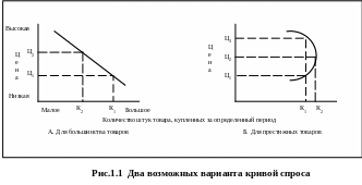 Большинство кривых спроса стремится вниз по прямой или изогнутой линии, как показано на рисунке 7а. Однако в случаях с престижными товарами кривая спроса иногда имеет положительный наклон типа представленного на рисунке 7б. Парфюмерная фирма обнаружила, что, повысив цену с Ц1 до Ц2, она продала духов не меньше, а больше. Потребители посчитали более высокую цену показателем более высокого качества или большей желательности этих духов. Однако при слишком высокой цене (Ц3) уровень спроса оказывается ниже, чем при цене Ц2. Спрос, вероятнее всего, будет менее эластичным при следующих обстоятельствах: