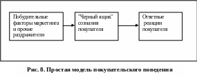 Рост размеров фирм и рынков лишил многих распорядителей маркетинга непосредственных контактов со своими клиентами, поэтому приходится все чаще прибегать к исследованию потребителей. Последнее время фирмы тратят очень много усилий на исследование зависимостей между побудительными факторами маркетинга и ответной реакцией потребителей. Основной вопрос: как именно реагируют потребители на резные побудительные приемы маркетинга, которые фирма может применять? Отправной точкой всех этих усилий является простая модель, представленная на рис. . На нем показано, что побудительные факторы, маркетинга и прочие раздражители проникают в "черный ящик" сознания покупателя и вызывают определенные отклики.