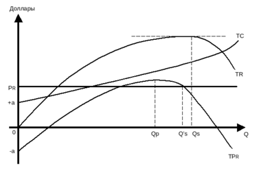 В последнем случае объем производства и реализации увеличивается вплоть до того момента, пока предельный доход от продажи Qs-й единицы не станет равен 0. Это значит, что совокупный доход более не может увеличиваться, следовательно, он достиг максимума. При максимизации прибыли объем производства устанавливается на уровне Qp, поскольку именно в этой точке достигалась максимальная разница между совокупным доходом и совокупными издержками, т.е. прибыль была максимальной. Легко заметить, что при максимизации торговой выручки прибыль фирмы понижается по сравнению с вариантом максимальной прибыли. Это обстоятельство обычно вызывает недовольство акционеров, которые могут установить менеджерам минимально допустимый уровень прибыли. В этом случае, если такой ограничитель снижения прибыли установлен на уровне PR, менеджеры будут наращивать объем продаж до тех пор, пока это не станет угрожать падением прибыли ниже допустимых пределов. Новый объем продаж будет установлен на уровне Qs', соответствующем точке пересечения прямой PR и прямой совокупной прибыли.