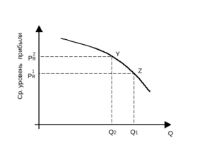 Т аким образом, распределение прибыли на две части и определение нормы удержания прибыли не простое дело и сопряжено с рядом трудностей и противоречий. При решении этой проблемы обычно придерживаются принципа "сбалансированного роста", то есть выбор темпов роста капитала фирмы и объёма ее продаж осуществляется с учетом нормы удержания прибыли и, следовательно, с оглядкой на средний уровень прибыли в целом (рис. 2). Очевидно, что при увеличении капитала и объёма продаж фирмы средний уровень прибыли понижается. Вследствие действия закона убывающей полезности (в данном случае доходности от дополнительных инвести­ций).