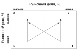 а рис. 9 стрелки показывают направление денежного потока. Миссия «денежных коров» состоит в том, чтобы генерировать денежный поток, который может быть использован «тотализаторами» (вложение средств с целью расширения рыночной доли, а, следовательно, увеличения прибыли). Миссия «звезд» – сохранить свою конкурентоспособность. Миссия «собак» – создать положительный денежный поток, который будет направляться в другие виды предпринимательства и постепенно осуществлять дезинвестирование (прекращение их деятельности).