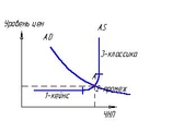 На классическом отрезке экономика достигает полной занятости, или естественного уровня безработицы. При достижении полной занятости и РОНП, равного потенциальному объему, экономика находится на, пределе своих производственных возможностей и любое дальнейшее повышение цен не приведет к увеличению РОНП. Отдельные фирмы могут сделать попытку увеличить объем производства, предложив более высокую цену за ресурсы. Но ресурсы и дополнительный объем продукта, получит одна фирма, а другие потеряют, поэтому цены на ресурсы возрастут, а РОНП не изменится.