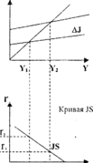 Пологая IS означает высокую чувствительность, эластичность инвестиций к изменениям процентной ставки. С помощью кривой JS иллюстрируют бюджетно-налоговую (фискальную) политику: увеличение государственных расходов ΔG сдвигает JS вправо(увеличиваются Y и г), сокращение налогов (-ΔT) сдвигает JS вправо, увеличение налогов(+ΔТ) перемещает ее влево (сокращаются г и Y).