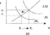 если Центробанк будет поддерживать неизменной процентную ставку г, то в ответ на рост налогов и сдвиг JS ( до уровня JS2). он должен уменьшить денежное предложение и это сдвигает LM влево(до уровня LM2 )