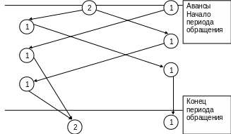 Производительный класс использует 1 млрд. лир, полученный от землевладельцев (за продажу сельскохозяйственных продуктов), на покупку изделий бесплодного класса (это не те изделия, которые покупаются землевладельцами). С помощью полученной суммы бесплодный класс возвращает свой аванс в размере 1 млрд. лир. Наконец, с выручки от продажи сырья и средств существования бесплодному классу, производительный класс может заплатить сумму 2 млрд. лир владельцам земли, которую он использовал. В конце периода собственники снова располагают доходом в 2 млрд. лир, а бесплодный класс – 1 млрд. лир, и обращение может начинаться сначала.