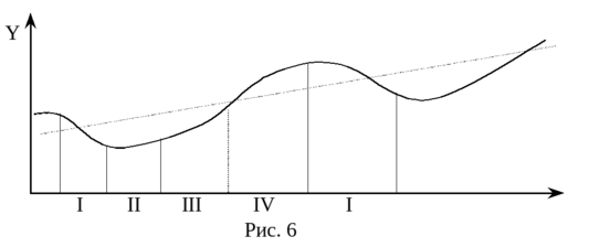 Промышленный цикл - это период, в течение которого капиталистическая экономика проходит четыре фазы своего развития и снова возвращается к исходной фазе. Циклический характер развития капиталистической экономики можно изобразить в виде графика (см. рис. 6). По горизонтальной оси расположены временные периоды, по вертикальной (Y) - объем производства. Римскими цифрами
