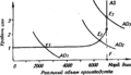 кономических ресурсов. Таким образом, получаем показатель нацинального дохода (НД). Личный доход-представляет собой полученный доход, в отличие от НД, который является заработанным доходом. Часть зароботанного дохода-взносы на соц. страхования налоги на прибыль-не поступает в распоряжения населения. ЛД можно вычислить путем вычитания из национального дохода взносов на соц. страхования, налог на прибыль, сумму всех трансфертных сбережений, нераспр. прибылей. ВНП дает оценить обьем годового производства страны. Но практически во всех странах отсутствует статистика на такие виды деятельности как репититорсво, уход за больными домашнее благоустройство итд которые несомненно увеличивают благосостояния общества. Не учитывается сектор теневой эк-ки, рэкет, наркотики которые отриц. сказываюся на эк-ку, Внп не вкл домработу которая увеличивают благосостояния общества. Отсутствует в этом показателе и климат, досуг… Учесть влияние этих факторов позволяет ЧЭБ. Совокупный спрос и совокупное предложение:понятие и графики. Макроэкономическое равновесие в модели “AD-AS” С