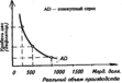 овокупный спрос-общий обьем спроса на товары и услуге в стране. Кривая совокупного спроса в этой модели внешне напоминает кривую спроса на отдельном товарном рынке. Но построена эта кривая в иной системе координат а оси абсцисс указываются значения реального объема производства (реального ВНП). А на оси ординат фигурируют не абсолютные показатели цен (например, в миллиардах долл.), а уровень цен, или дефлятор. Итак, кривая AD иллюстрирует изменение суммарного (совокупного) уровня всех расходов домашних хозяйств, бизнеса и правительства в з