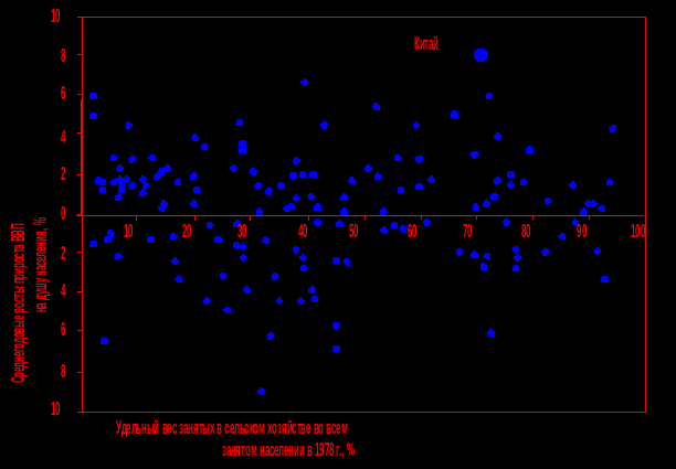 График 4 показывает, что темпы экономического роста не зависят от структуры занятого населения. При доле занятых в сельском хозяйстве на уровне, близком к 70,5% (Китай в 1978 г.), значения среднегодовых Темпов экономического роста в разных странах колеблются от -6,0% до +8,2%. Следовательно, структура занятости не объясняет высокие темпы экономического роста в Китае.