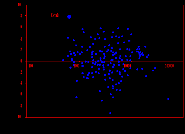 График 3 показывает, что такой закономерности не существует. При одних и тех же душевых показателях ВВП возможен и быстрый рост и глубокое падение. Ни одна другая слаборазвитая страна не имела темпов роста, сколько-нибудь близких к китайским. Более того, темпы роста Китая оказались уникальными для всей мировой экономики.
