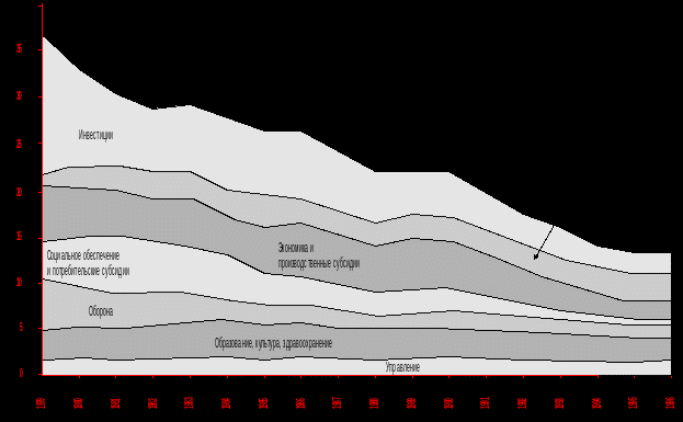 Государственное потребление было уменьшено с 15,2 до 10,6% ВВП. В структуре общих государственных расходов наиболее резко были сокращены расходы центрального правительства (tm) с 20,7% ВВП в 1979 г. до 3,8% ВВП в 1996 г. Снижение расходов на провинциальном уровне было осуществлено в меньших, но, тем не менее, также весьма впечатляющих размерах - с 15,7 до 8,3% ВВП.