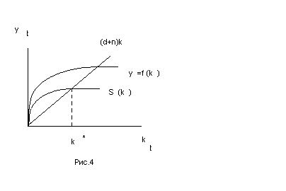В модели отражается концепция устойчивого стационарного состояния, когда при отсутствии технического прогресса и постоянной доли обновляемого капитала равновесие обеспечивает некоторый равновесный уровень капиталовооруженности (k t ); при динамическом равновесии прирост капиталовооруженности должен быть равен нулю. Тогда S y f(k t ) = ( d=n) k t .