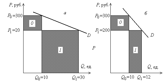 На рис. 1 изображены два варианта графиков спроса. На рис. 1, а снижение цены с Р0 до Р1, на 100 руб. (на 33%) приведет к росту величины спроса с Q0 до Q1, на 20 ед. (на 200%). Коэффициент эластичности будет равен 6 (200:33), т.е. он больше 1, и спрос эластичен. А что произойдет с выручкой от реализации продукции? Она увеличится с 3000 (30010) до 6000 руб. (20030), т.е. вырастет в два раза. Заштрихованные прямоугольники 0 и 1 наглядно показывают увеличение выручки от реализации продукции при снижении цены в условиях эластичного спроса. Площадь прямоугольника 1 заметно больше площади прямоугольника 0.
