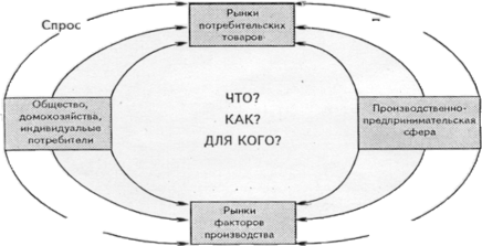Схема лишь в наиболее виде показывает направления взаимосвязей, обусловленных предложением и спросом. В рыночной экономике нет структур, которые занимали бы место между производственной сферой и потребителями, диктуя им, что и как производить и для кого предназначено произведенное.