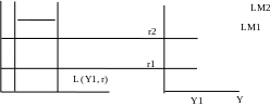 Проведение кредитно-денежной политики вызовет сдвиг кривой LM. Если ЦБ уменьшит предложение денег с M1 до М2, то ставка процента возрастет для каждого уровня дохода Y, следовательно, кривая LM сдвинется вверх.