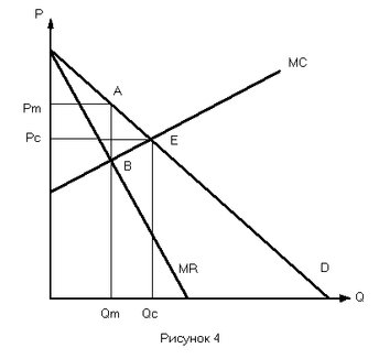 На конкурентном рынке равновесие может быть достигнуто в точке Е, где Рс = МС. В условиях монополии мы перемещаемся к монопольной цене Pm и количеству продуции Qm. Поскольку монопольная цена превышает предельные издержки (Pm > MC), то величина излишка потребителей и излишка производителей меняются. Площадь треугольника АВЕ соответствует величине чистых убытков от монопольной власти, или так называемой величине мертвого груза монополии. Такие треугольники называют харбергеровскими, по имени американского ученого А. Харбергера, который одним из первых стал изучать положительные и отрицательные стороны монополии для общества.