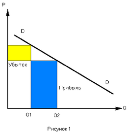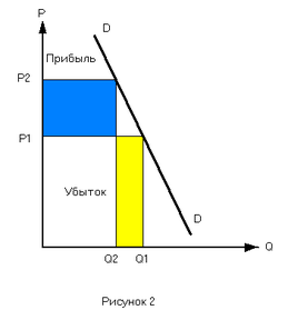 самом деле, это легко доказать. Предположим, что череповецкая спичечная фабрика является монополистом в своей отрасли по России. Предположим также, что цена спичек 50 коп. Фабрика, увеличивая цену до 1 руб., скорее всего, получит большую выручку, так как спички – товар, спрос на который неэластичен по цене (как на рисунке 2). Спички мы будем покупать всегда, независимо от их цены, поскольку практически в каждом доме есть газовая плита. Но если взять рынок бриллиантов и монополиста на нем “Де Бирс”, то повышение цены приведет к уменьшению выручки, более высокая цена отпугнет покупателей. Компенсировать отток покупателей dQ, увеличением цены dP не удается, так как спрос на бриллианты неэластичен (см. рисунок 1).