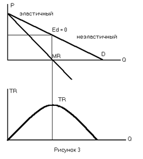 Еще раз обратимся к первым двум рисункам. До каких пор можно снижать цену в первом случае и повышать во втором? Очевидно не до бесконечности. На самом деле оптимум находится на кривой спроса в точке, где Ed = 0 (рисунок 3). В этой точке выручка TR будет максимальна. Но эта точка более харктерна для совершенной конкуренции (Р тогда будет равно МR), для монополии точка на кривой спроса будет располагаться несколько выше.