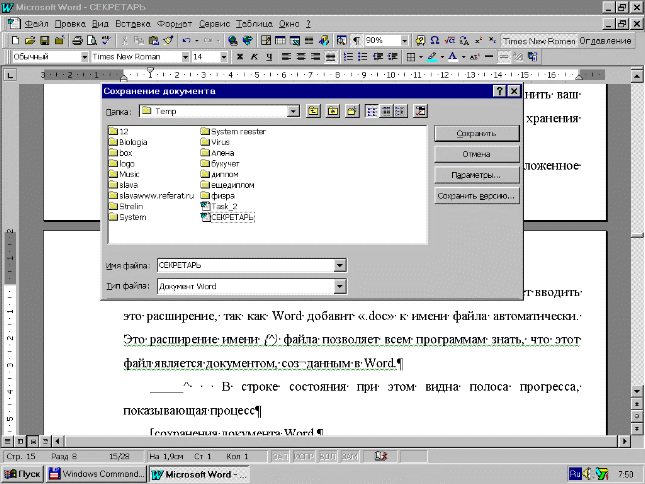 Вы можете сохранить свой документ на любом диске и в любой папке дисковой системы. Можно также сохранять документ в файлах различного формата, что даст возможность другим программам открывать файлы с вашими документами и работать с ними, как если бы это были их собственные документы.