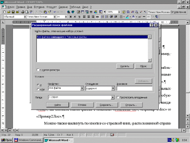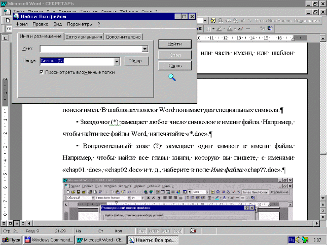 Вы можете также производить поиск без использования специальных символов. Для этого достаточно набрать часть имени - любую последовательность символов, которые содержатся в имени. Например, введя “Име”, вы сможете найти файлы с именами “Именины. dос”, “Пример 1.doc” и “Пример2. dос”.