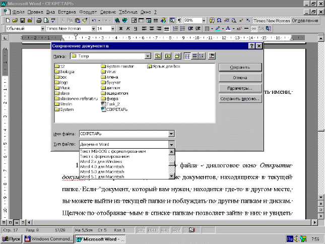 3. Можно также использовать поле Тип файла, чтобы найти файлы определенного формата из тех, что Word позволяет открыть. Например, выбрав в этом поле “*.dot”, вы найдете все шаблоны документов Word, “*'.txt” позволяет найти все текстовые файлы, а “*.*” даст вам список всех файлов. Список возможных типов в этом окне зависит от установленных на компьютере средств преобразования текстовых и графических файлов, которые вы выбрали при установке Word.