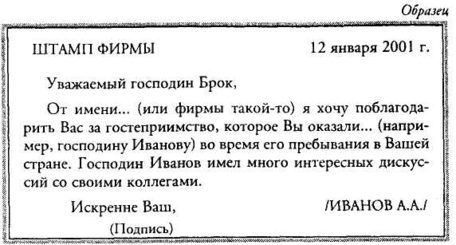 Ниже, немного отступив, с прописной буквы: "От имени... (или фирмы такой-то) я хочу поблагодарить Вас за гостеприимство, которое Вы оказали... (например, господину Иванову) во время его пребывания в Вашей стране". (Продолжается письмо тут же, рядом, в строку). "Господин Иванов имел много интересных дискуссий со своими коллегами" (точка).