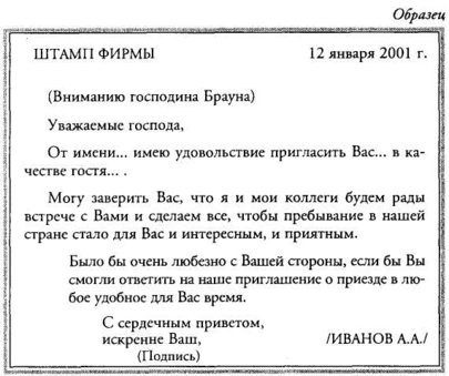 Должны быть четко изложены предмет предстоящих переговоров, сроки, продолжительность визита, вопрос виз и в случае необходимости вывоз транспорта от Москвы до вашего предприятия, вопросы приобретения билетов в оба конца, размещения в гостинице, место и время встречи (в Москве, в вашем городе и т.п.).