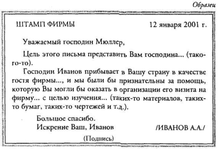 Ниже, отступив: "Господин Иванов прибывает в Вашу страну в качестве гостя фирмы..., и мы были бы признательны за помощь, которую Вы могли бы оказать в организации его визита на фирму... с целью изучения... (таких-то материалов, таких-то бумаг, таких-то чертежей и т.д.)".