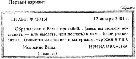 Первый вариант. Опять-таки нужно соблюсти все реквизиты, отступив от края, с прописной буквы текст: "Обращаемся к Вам с просьбой... (здесь вы можете поставить - или выслать, или послать) к нам... (свои реквизиты)... (такие-то или такие-то материалы, чертежи и т.д.)".