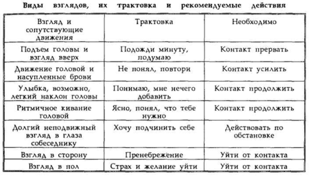 Вообще, взгляд является наиболее естественным средством неречевого общения. Он может говорить о многом, что видно из нижеприводимой таблицы.