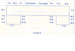 Однак, при такому розміщенні чергування чоловік-жінка можливе лише тоді, коли за столом сидить 6, 10, 14, 18, 22 тощо особи. Якщо учасників прийому 8, 12, 16, 20 тощо (число, кратне чотирьом) для чергування чоловік-жінка необхідно змістити господиню на одне місце (схема 6).