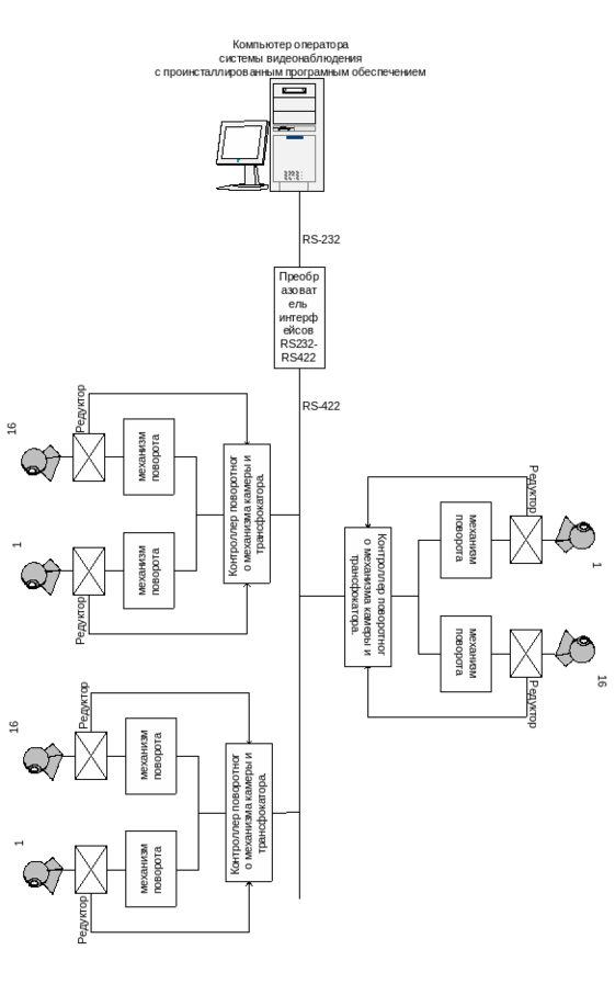 В качестве протокола для управления камерами выбран RS-232, который связывает компьютер (с соответствующим программным обеспечением) и преобразователь интерфейсов. Протокол RS-422 предназначен для передачи управляющих воздействий на контроллер поворотных механизмов камер и трансфокаторов.