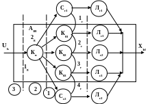 Кв – командир взвода; К01, К02, К03 – командиры отделений; Лс1, Лс2, Лс3 – личный состав 1, 2, 3 отделений; Up – распоряжения, команды командира роты; Х1в – комплексный показатель эффекта действия взвода; А1В – условный оператор преобразования взводом распоряжения командира роты Uh в комплексный показатель Х1d