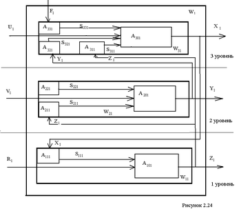 Как правило, при системном анализе рассматриваемую структуру моделируемого подразделения W1 можно представить состоящей из двух частей: общесистемной и локальной. Общесистемная составляющая W31 входит в модель верхнего уровня метасистемы Фс1, а локальная составляющая, образованная первым и вторым W11; W21 уровнями, входит в модель нижнего уровня метасистемы Фс2:
