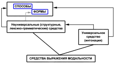Итак, роль средств состоит в связи способов и форм выражения модальности. Но у некоторых средств есть ещё и другая функция: они помогают той или иной грамматической форме приспособиться к выражению модальности. Первые из описанных средств мы будем называть универсальными (к ним относится интонация), вторые - неуниверсальными. Представим всё сказанное в виде схемы 2. Способы и формы выражения модальности объединяются в своеобразный блок. Средства выражения модальности как бы соединяют формы выражения модальности со способами её выражения. В этом и заключается их роль при формировании высказываний . Подчеркнем, что неуниверсальные средства выражения модальности относятся к грамматике, а универсальные - к фонетике. Это отражено на схеме в виде разных уровней их расположения.