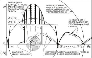 Илл.3. Волна, несущая Землю, замкнута на сфере 3.25 RE. Деформация, выраженная радиозеркалом F2, быстро приближается к замыканию новой волны с отрицательной фазой около самой поверхности планеты. Причина быстрого приближения катастрофы – быстрое заполнение 1-й волны-оболочки геостационарной орбиты спутниками (ядрами конденсации массы вакуума).