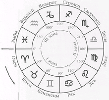 В гороскопе эклиптика представлена в виде круга (360°), разделенного на 12 секторов — знаков Зодиака (от гр. «зодиакос киклос» — «звериный круг»). Названия знаков совпадают с названиями созвездий, расположенных вдоль эклиптики. Однако в отличие от созвездий каждый знак занимает ровно 30°. Зодиак ведет свой отсчет от точки на эклиптике, в которой Солнце находится в момент весеннего равноденствия. От этой точки отчисляются градусы в первом знаке Зодиака — Овне. Дальше идут Телец, Близнецы, Рак и т.д.