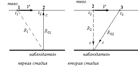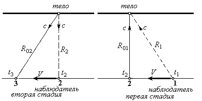 Первая стадия. Мы обращаем внимание на то, что наблюдатель относительно тела будет двигаться в обратную сторону. Итак, в момент времени t1 в точке 1 движущийся наблюдатель запускает световой импульс. Для наблюдателя, покоящегося на неподвижном теле и принявшем в момент t2 световой сигнал, будет казаться, что световой импульс прошел расстояние R1. На самом деле в момент приема действительное расстояние, которое прошел свет, будет равно R01.