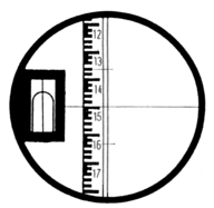 Цилиндрический уровень с ценой деления 15 град. расположен в коробке 1 вместе с призменным устройством, при помощи которого изображение концов пузырька уровня в виде двух его половинок передаётся в поле зрения трубы (б). Точное привидение визирной оси трубки в горизонтальное положение выполняется элевационным винтом (9) и заключается в совмещение изображений концов пузырька уровня. Цилиндрический уровень имеет четыре юстировочных винта, закрытых крышкой.