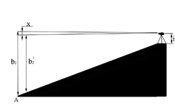 Визирная ось зрительной трубы должна быть параллельна оси цилиндрического уровня. Поверку выполняют двойным нивелированием по способу вперёд точек А и В, прочно закреплённых металлическими костылями на расстоянии 50-70 м. один от другого. Если визирная ось зрительной трубы не параллельна оси цилиндрического уровня, то в отсчёты по рейке войдёт погрешность Х.
