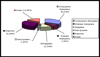 Распределение пожаров по континентам планеты в относительных показателях приведено на рис.4.1.1.