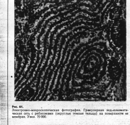 Строение. Эндоплазматическая сеть представляет сложную систему каналов и полостей размером до 500А и более. Каналы и полости соединяются между собой и образуют ветвистую сеть, которая пронизывает всю цитоплазму клетки, как это показано на рисунке 60. Полости и каналы эндоплазматической сети отграничены от цитоплазмы мембранами. Толщина мембран около 75А.